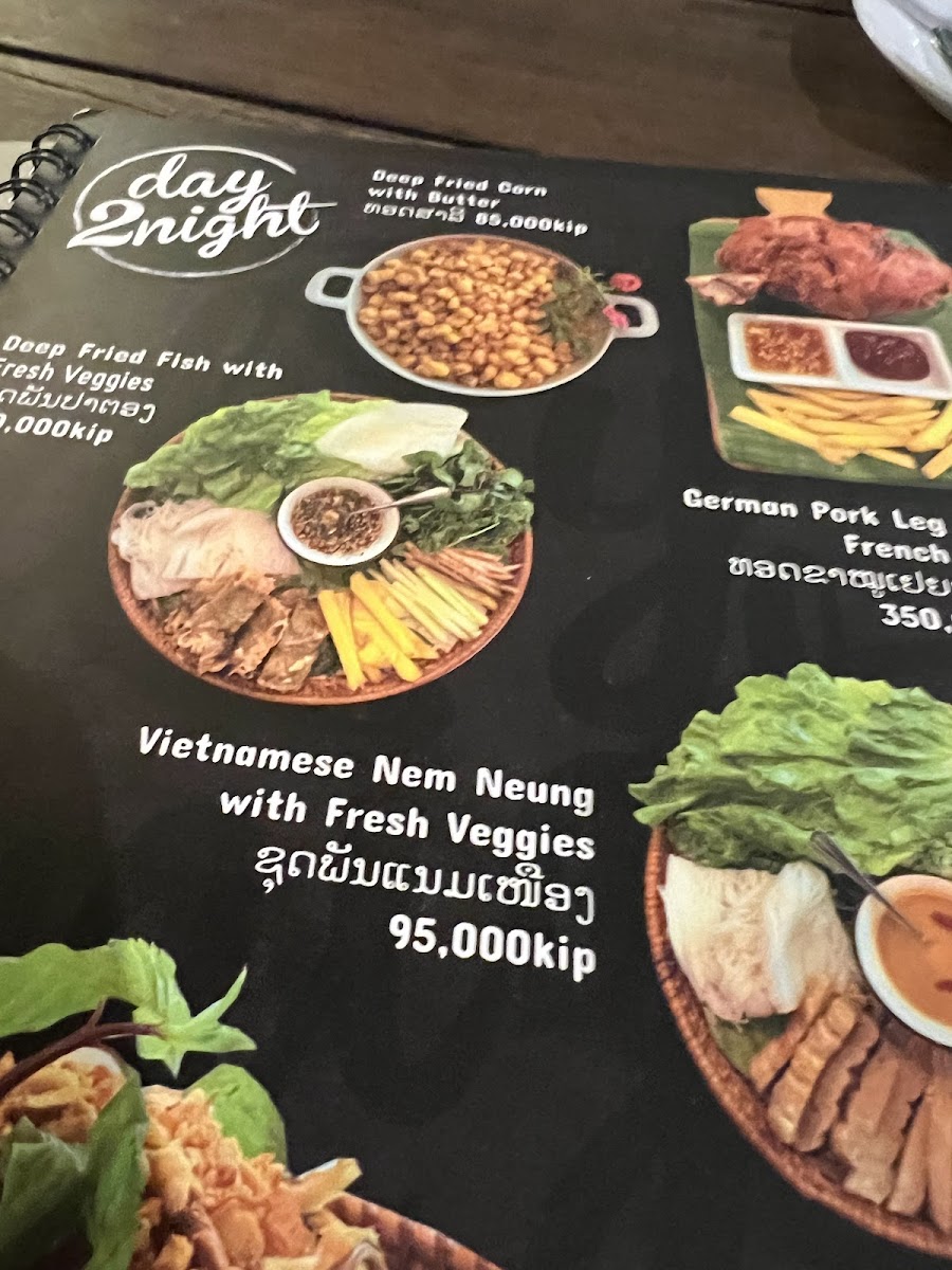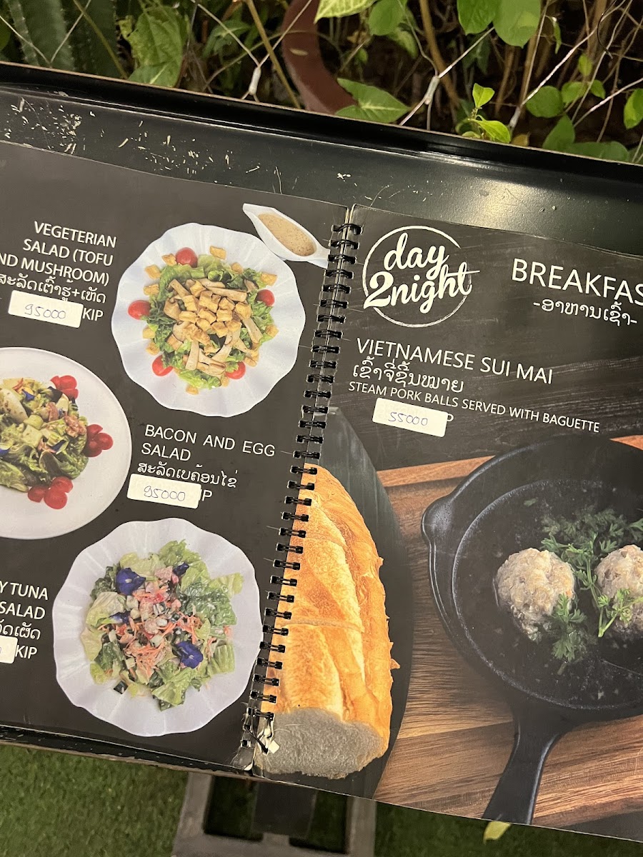 The menu at Day2Night Vietnamese Cuisine in Vientiane offers a delightful mix of traditional Vietnamese and refreshing modern options. Standout dishes like Bhan Bo Loc, a savory dumpling-style dish, and Rouleaux de Printemps Frais Aux Crevettes, featuring fresh shrimp spring rolls, provide authentic flavors that transport diners to Vietnam. For those seeking a light bite, the Shrimp Banh Beo is an excellent choice with its delicate rice cakes topped with shrimp. The restaurant also shines with its vibrant Green Tea Honey Toast, a perfect blend of sweetness and crunch. Vegetarians will appreciate the Deep Fried Tofu, crispy on the outside and soft inside, as well as the refreshing Tuna Salad that balances freshness with zest. To wash it all down, guests can opt for the refreshing น้ําอัญชัน มะนาว โซดา or a cold bottle of Tuborg Beer or the local favorite, เบียร์ลาว, which perfectly complements the meal. This menu truly offers a well-rounded dining experience, combining the best of flavors from both Vietnam and Laos in a warm, inviting setting.